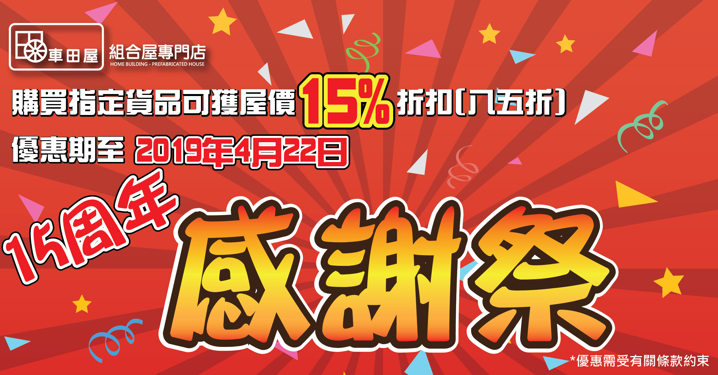 為慶㊗️車田屋成立 1️⃣5️⃣周年,舉行 1️⃣5️⃣天限時優惠,組合屋屋價 1️⃣5️⃣ % OFF‼